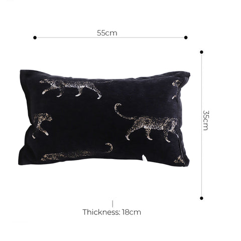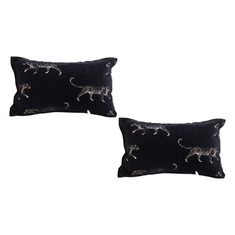 - Add a touch of sophistication to your home with this black cushion cover, adorned with shimmering embroidered panther motifs. The luxurious fabric offers both style and comfort, making it a perfect addition to any contemporary or eclectic decor. Pair it with your favorite chair, sofa, or bed for a striking yet cozy look.