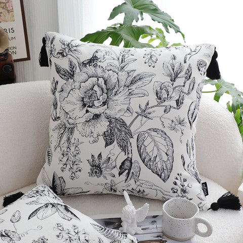 SOGA 2X 50cm Throw Pillow Black and White Elegant Floral Print with Tassel Accents Home Decor
